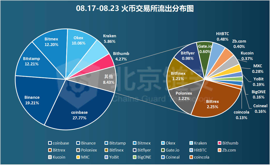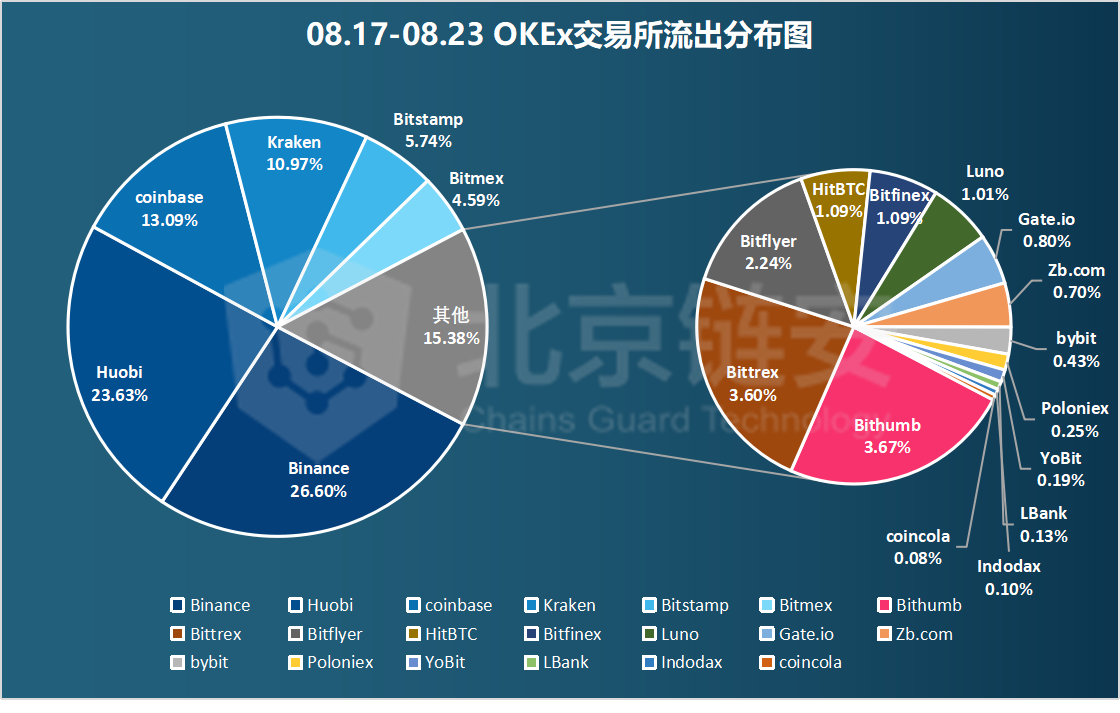 在过去一周,交易所之间的比特币来往又呈现怎样的分布呢?我们将币安、火币、OKEx三大交易所流出到各交易所的比例在这里也向各位呈现。
