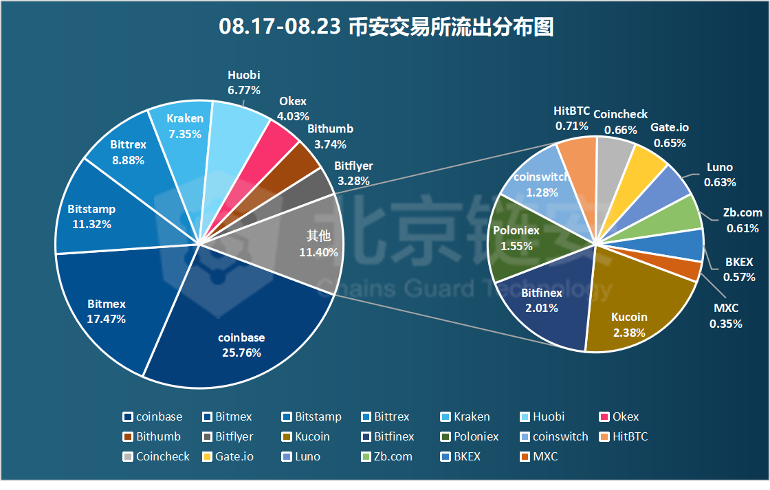 注:以上比例根据各交易所流出到已确定主体地址中的分布计算,排除了未确定主体的地址和独立地址,即在交易所流出的所有比特币中,相关主体的实际占比会更小一些。