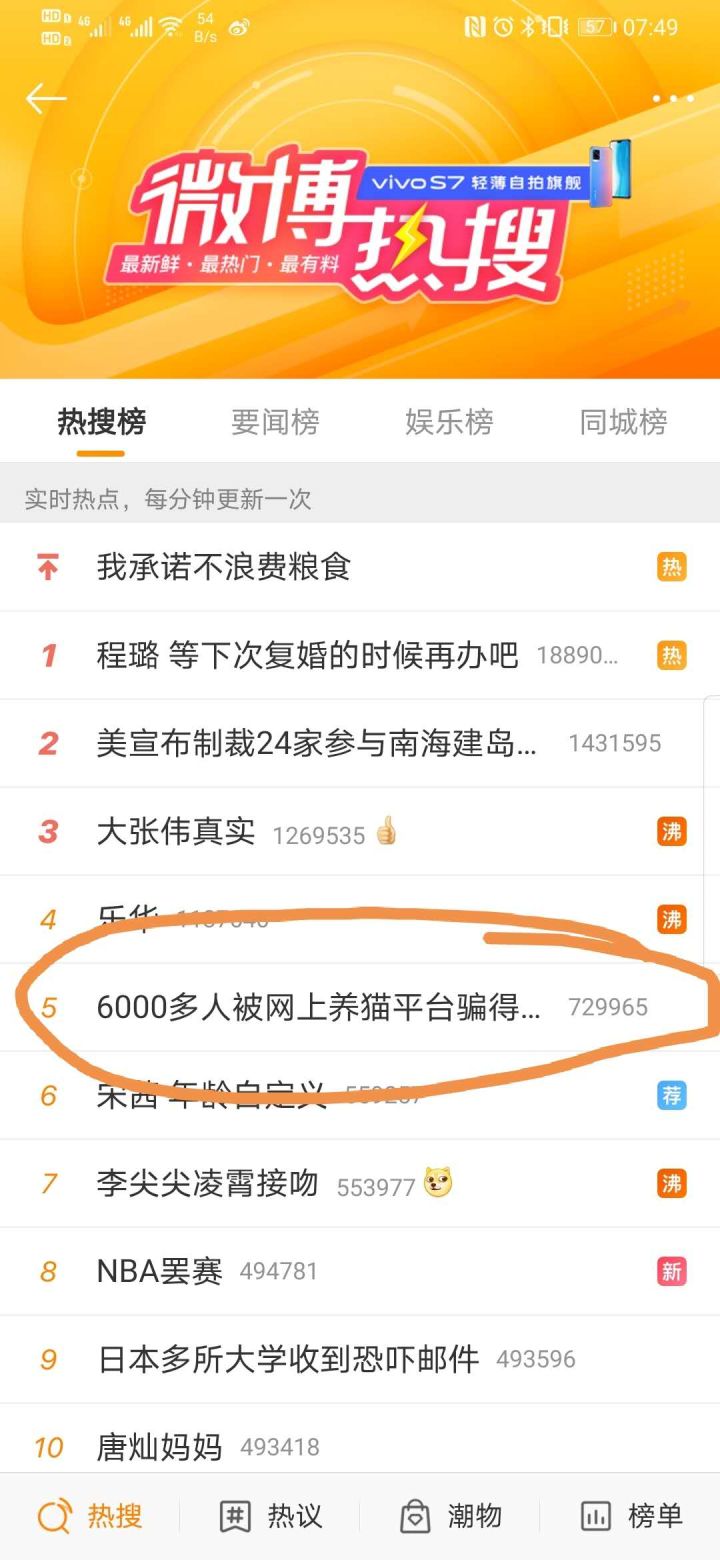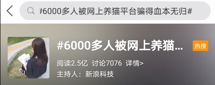 昨天一条名为#6000多人被网上养猫平台骗得血本无归#的热搜吸引了鉴叔的注意。