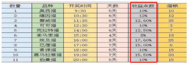 假设你的猫买进的时候是1000元,以10%的日收益点数做计算,喂养周期是5天,那么5天后你的猫就价值1500元。
