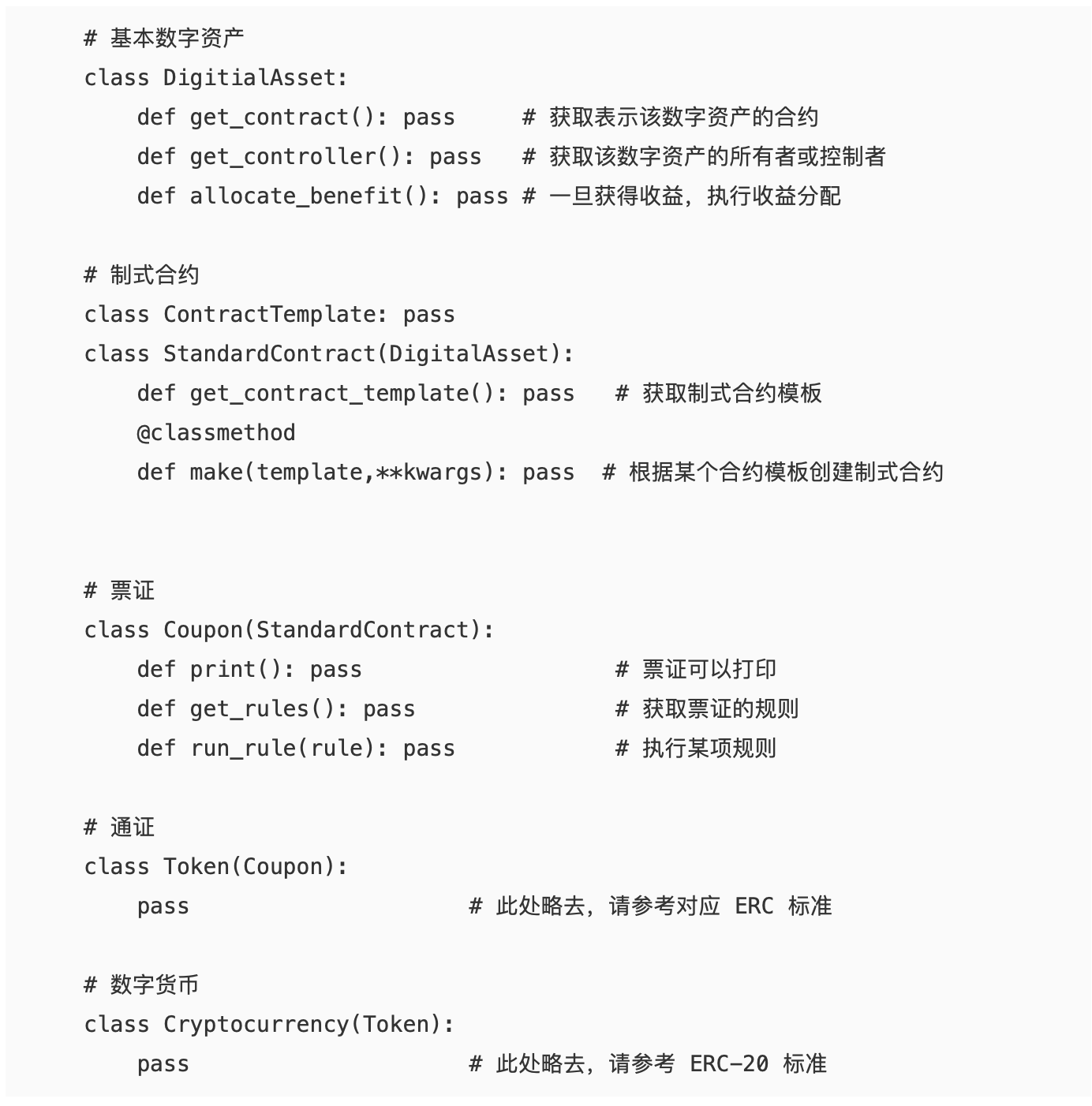 下面不再对理论问题进行详细阐述,而是直接以类 Python 伪代码方式描述几类主要的数字资产。
