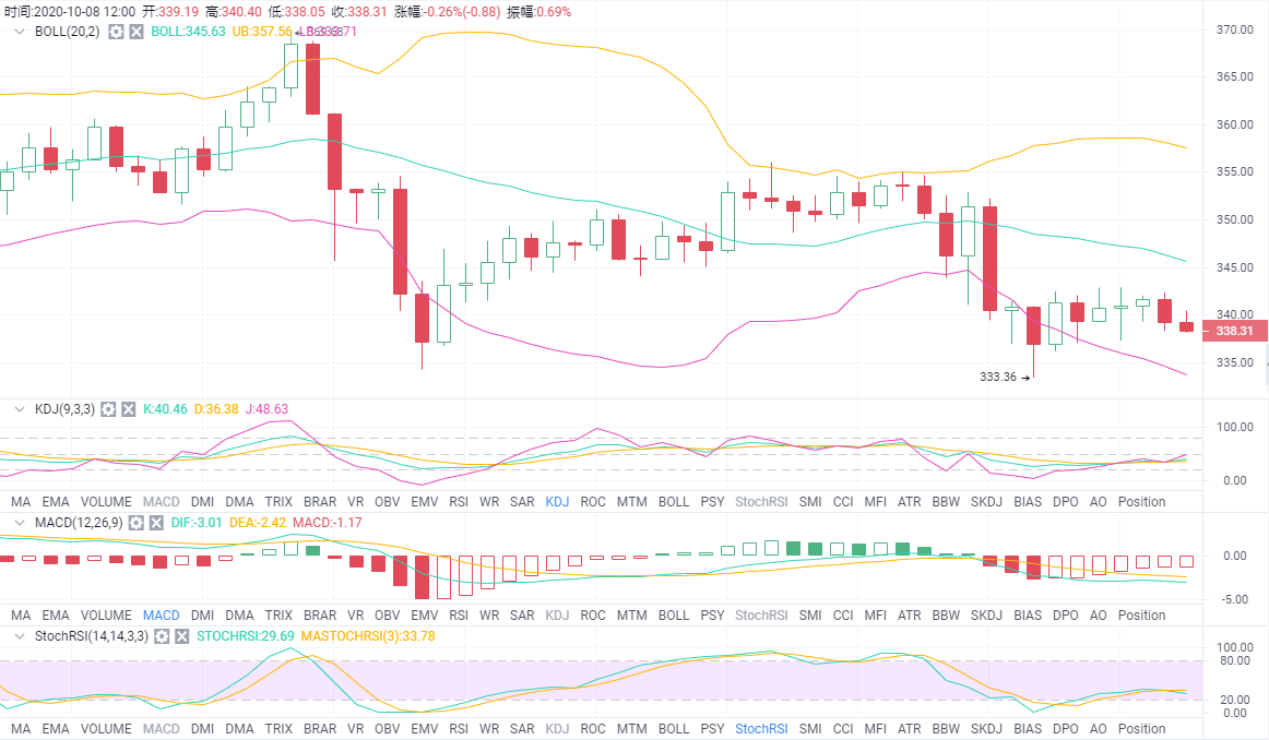 ETH:四小时级别线来看,以太处于下降趋势当中,昨日插针下破速阻中线形成一个假突破,不必太过担心,结合附图来看,短期上冲的动能依旧存在,并未出现见顶信号,随着大饼的变盘节点来临,以太也会随之走出突破,近期关注三个点位,332、344和350位置,日内可根据大饼思路来操作。