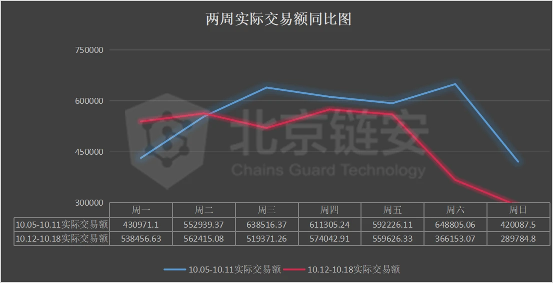 我们可以发现诸如交易数、活跃地址数变化也不大,特别在事件发生的周五并未激增,甚至体现交易所活跃度的大额转账数甚至与上周相比同比下降。