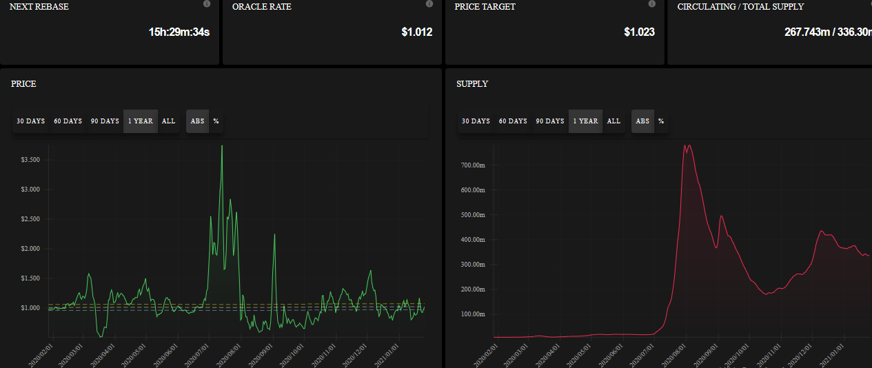 This can be confirmed by the price fluctuations and supply changes of AMPL in the past year: In June 2020, affected by the influx of hot money, the price of AMPL continued to rise, reaching a maximum of nearly 4 US dollars. Afterwards, as speculative funds withdrew, AMPL was sold and the price fell below $1, and then the supply of AMPL began to fall rapidly.