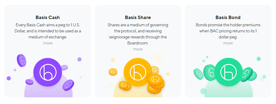 There are three types of assets in the Basis Cash system: BAC (Basis Cash): a stablecoin that the protocol aims to keep value pegged to $1. BAB (Basis Bond): similar to ESD coupons, bonds are sold at a certain discount, and can be redeemed at a price of $1 when the BAC price normally returns to $1. BAS (Basis Share): Receive the remaining commitment rights after all bonds are redeemed.