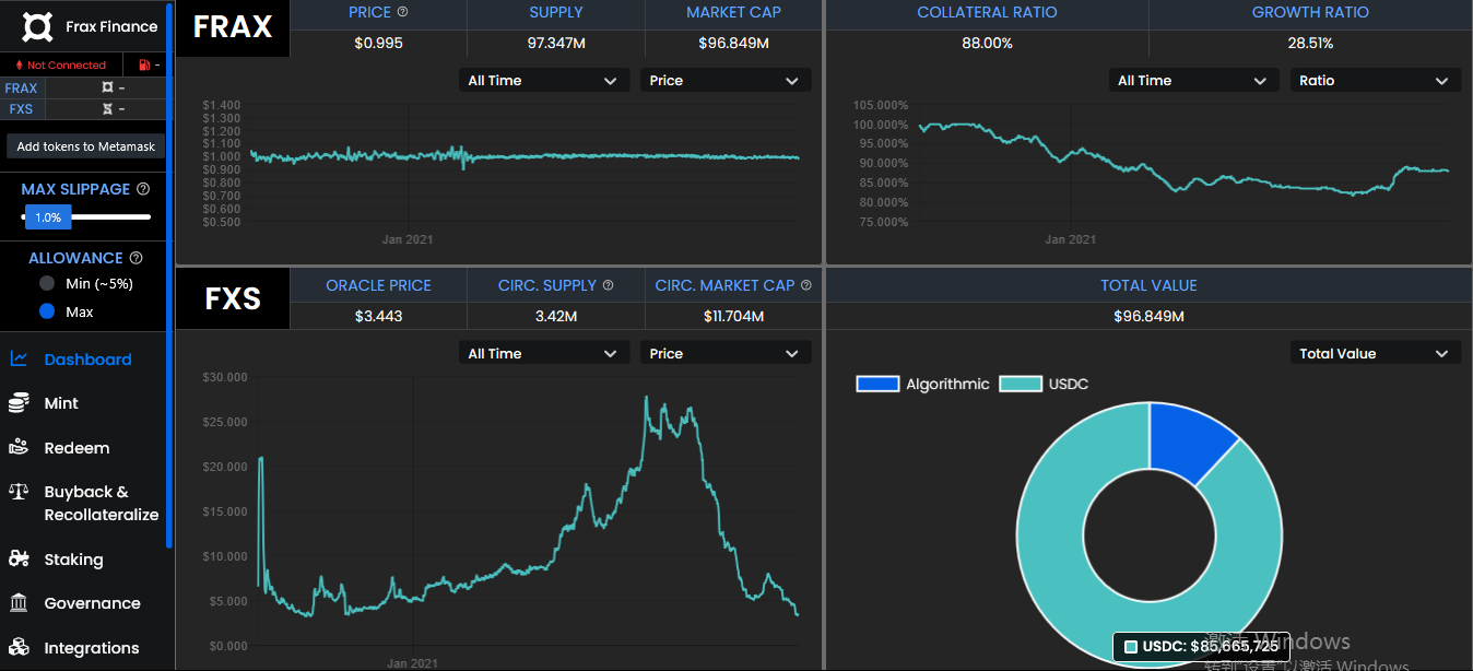 In order to ensure that the actual mortgage rate is equal to the algorithm-adjusted mortgage rate, FRAX has designed Buybacks and Recollateralization mechanisms. The re-mortgage mechanism, that is, when the system mortgage rate is raised, in order to attract users to increase the amount of USDC in the system, the system sets up incentive measures (the current bonus rate is 0.2%): at this time, anyone who adds USDC to the agreement can exchange for more A large number of FXS, for example, users add USDC worth 1 USD to the system in exchange for FSX worth USD 1.0075; the repurchase mechanism is that when the system mortgage rate is lowered, users can exchange USDC of the same value with FXS to the system.
