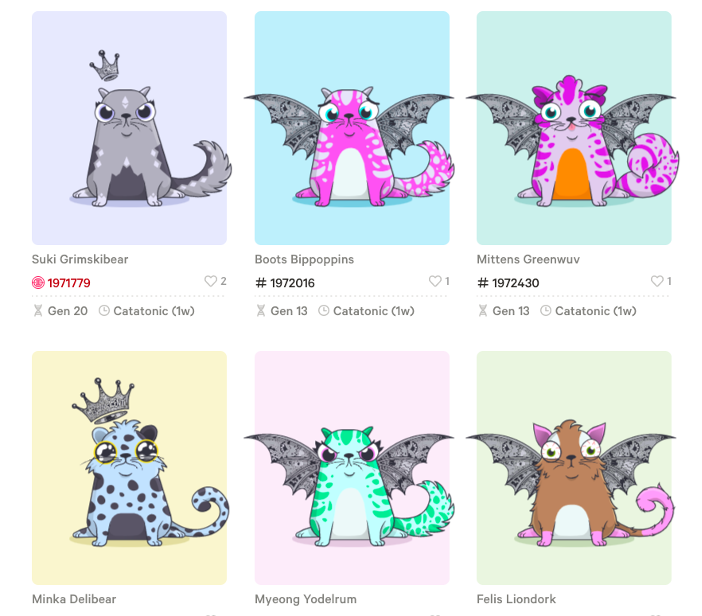 2017年12月,这款游戏非常受欢迎,甚至造成了Ethereum拥堵。传闻,在炒作的高峰期,CryptoKitties有150万用户,他们贡献了价值4000万美元的交易。最贵的小猫 “龙 “以600ETH(17万美元)的价格售出。