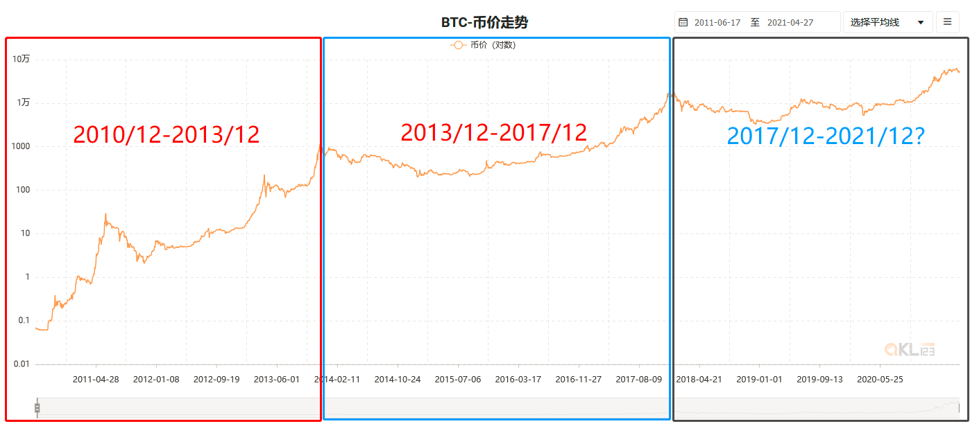 第一轮:2010年12月-2013年12月,比特币价格从0.2美元左右上涨至1127美元左右;