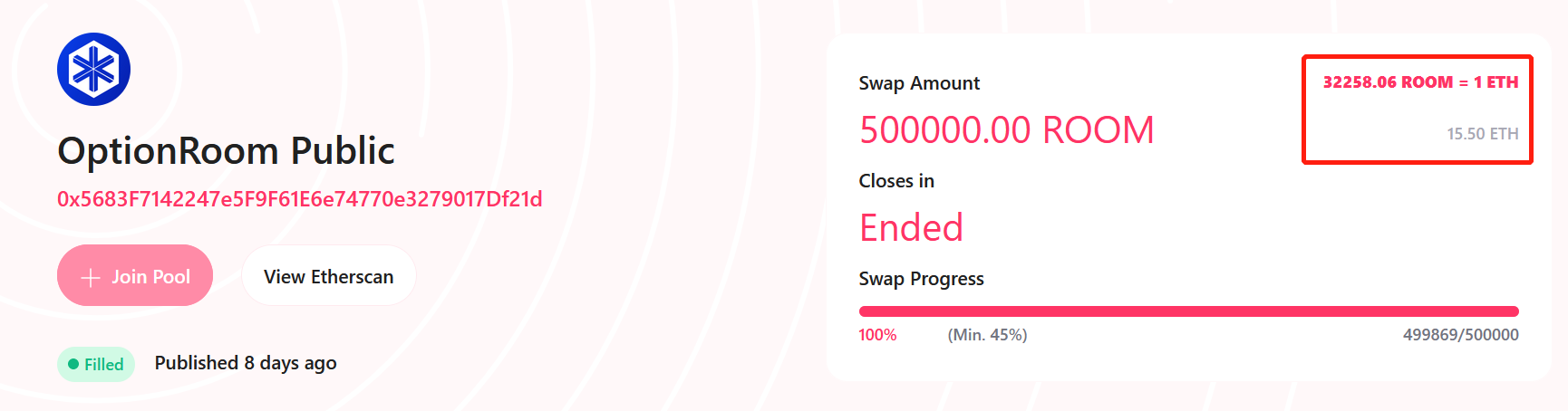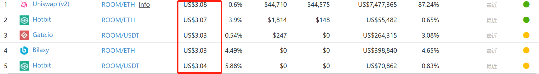 两个月前,Room以1ETH=32258ROOM(≈0.052U)的价格登录Polkastarter,售出30ETH(≈96.7万个ROOM)。ROOM上线Uniswap交易所之后,价格直线飙涨至3U,涨幅5700%