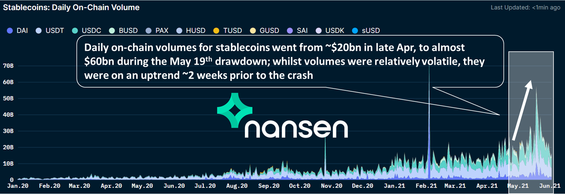 稳定币的每日链上交易量,图表来自Nansen