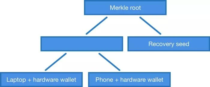 但有了默克尔公钥树,我们就不必局限于 m-n 多签名脚本了。我们可以做一棵使用任意公钥组合的树。举个例子,如果我们有一个笔记本电脑,一个手机,一个硬件钱包和一个助记词,我们可以构建一棵默克尔树,允许我们使用 笔记本电脑 + 硬件钱包、手机 + 硬件钱包 或者单独的助记词来使用比特币。这是当前的 OP_CHECKMULTISIG 做不到的 —— 除非你使用 “IF - Else” 式的流程控制来构造更复杂的脚本。