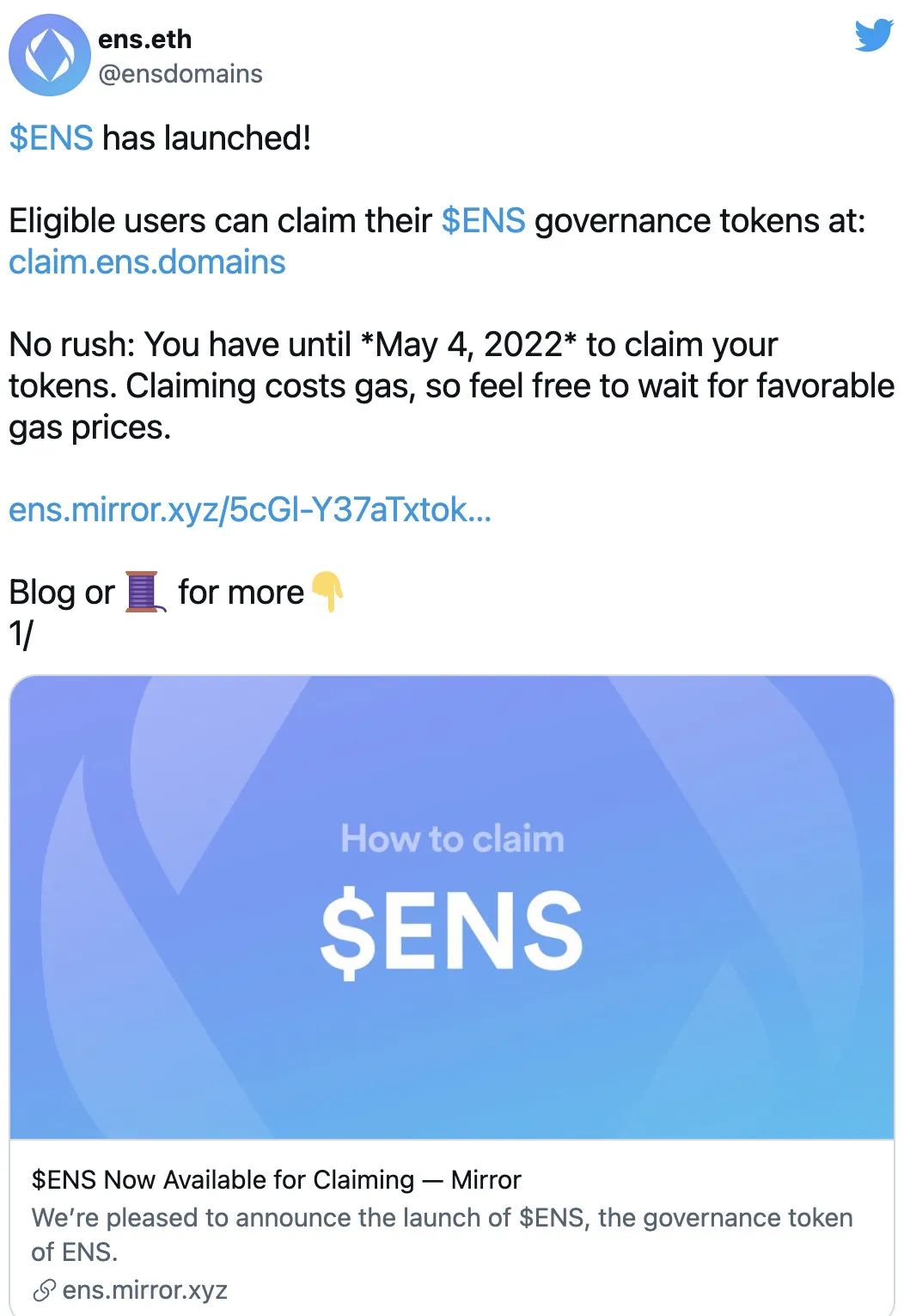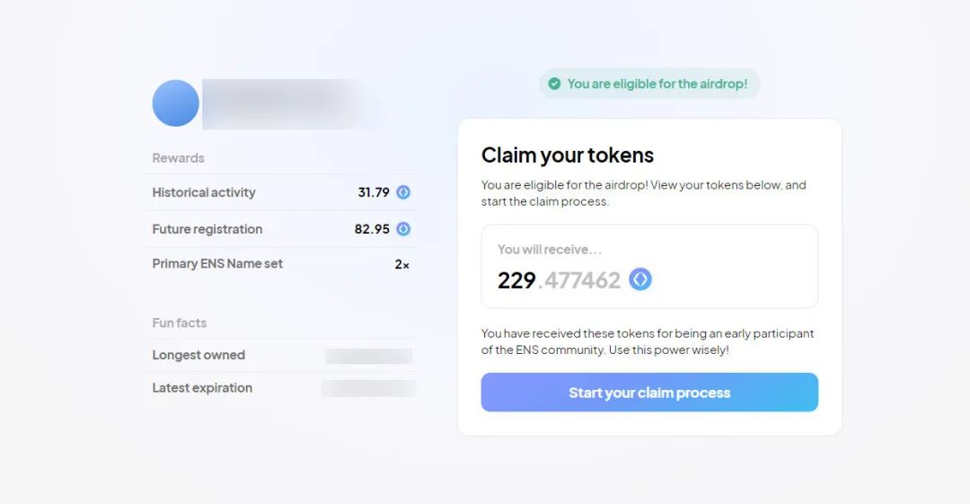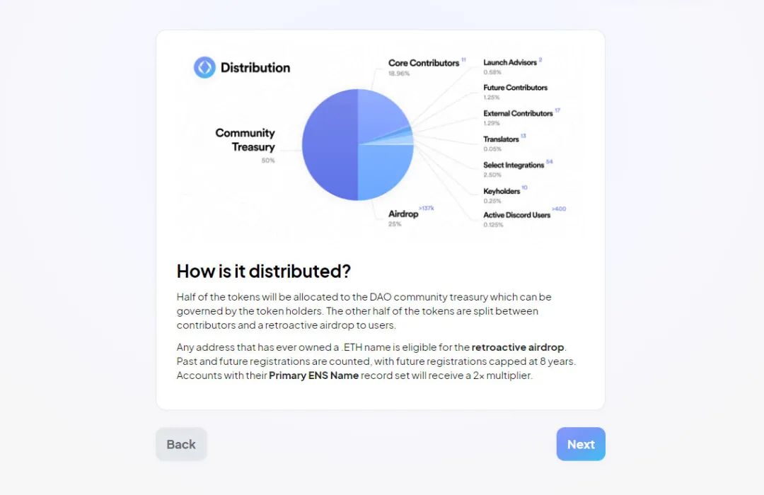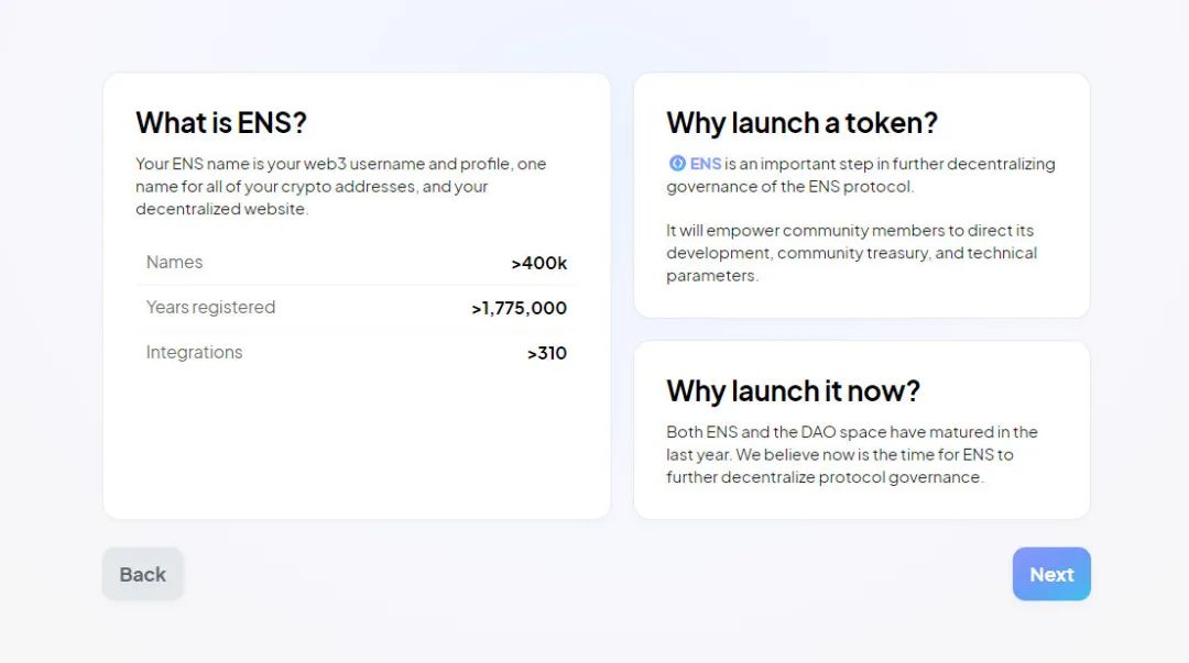 如果您曾经拥有 ENS 名称,您就有资格获得 $ENS 治理代币。领取将于2021年11月8日开始,持续到2022年5月4日,之后任何剩余代币将被发送到DAO金库。