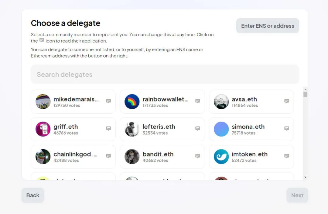 可以选择一个社区成员来代表自己(可以随时更改),通过输入 ENS 名称或以太坊地址委托给未列出的某个人或您自己。