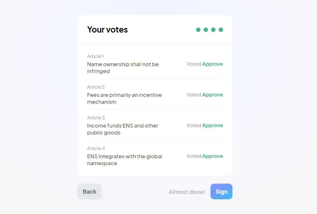ENS团队已经创建了一套初步的社区指南,可以对可申报的ENS分配进行投票或反对。投票是不用gas的,并使用Snapshot在链下进行。