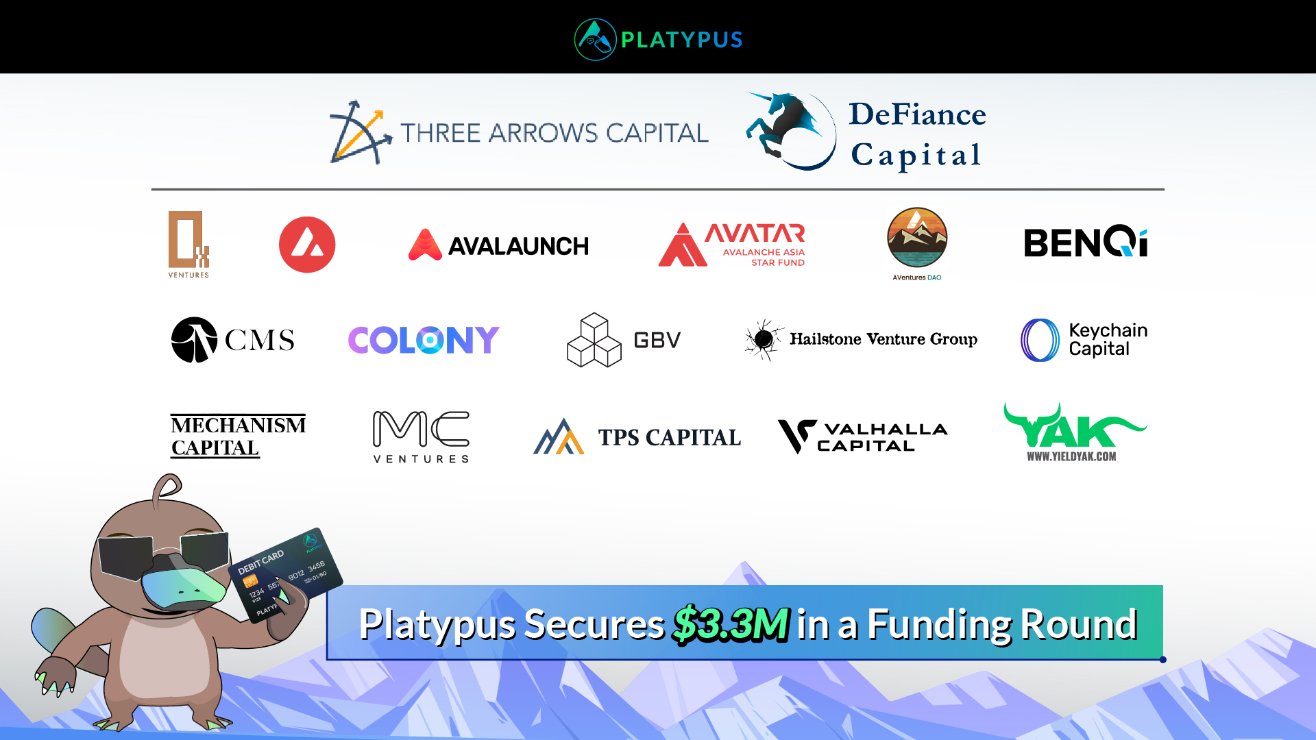12월 2일 아발란체 생태안정화 환전 프로젝트Platypus미화 330만 달러의 파이낸싱 완료 발표 이번 파이낸싱 라운드는 Three Arrows Capital 및 DeFiance Capital, 0xVenturesDAO, Avalanche, Avalaunch, Avatar, AVenturesDAO, Benqi, CMS, Colony, GBV, Hailstone, Keychain, Mechanism, Muhabbit, TPS, Vahalla Capital, YieldYak 등이 투표에 참여했습니다.