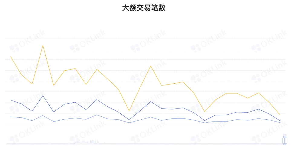 欧科云链OKlink数据显示,链上转账次数上周大幅下跌,“1000 ETH 以上”、“2000 ETH 以上”以及“5000 ETH 以上”分别环比下降 32%、30%、23%,大额巨鲸交易热情明显降低。