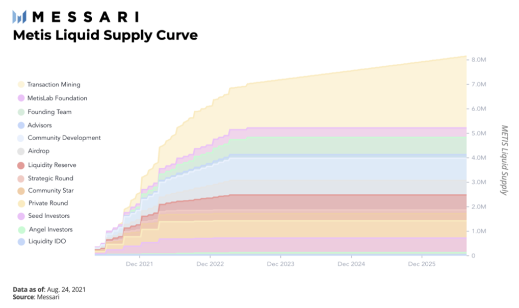 Metis 将 49.3%(或 493 万 METIS)分配给社区计划(空投和社区参与激励)、去中心化交易所等市场以获得充足的交易流动性、早期贡献者(公共和私人投资者)、团队和 MetisLab 基金会。团队、基金会和私人投资者的分配受制于 12-18 个月的归属时间表,这使得 METIS 早期的波动相对较低。