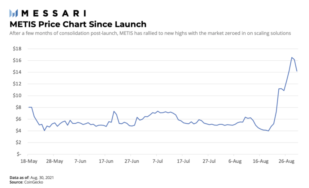 METIS 代币于 2021 年 5 月 13 日在通过 PAID 网络的IDO和与 Gate.io 的初始交换产品 (IEO) 期间首次分发。以 5 美元的 IDO 价格推出后,METIS 迅速上涨到 8 美元。然后它在 5 美元附近盘整了三个月,然后在最近的市场复苏中升至新高。