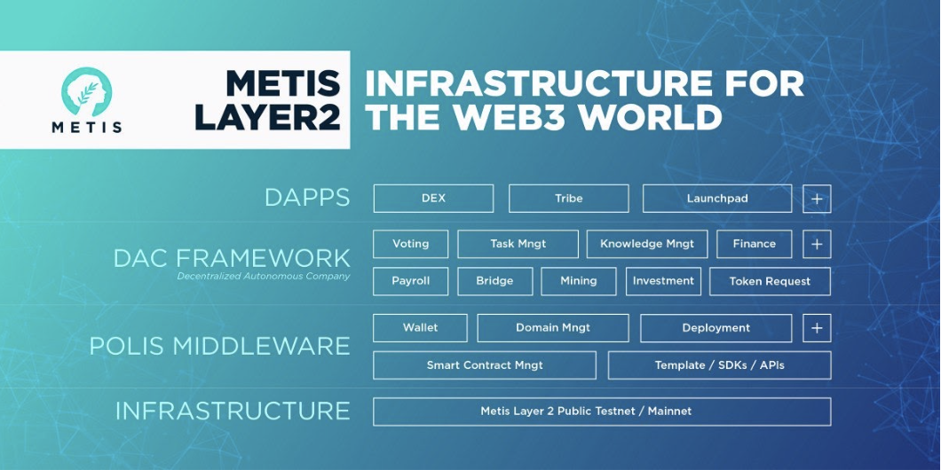 Metis的目标不仅仅是降低链上GAS费和提高链上交易处理效率,它更希望自己成为Layer2层的基础设施,致力于Layer2功能的可扩展性和易构建性,让开发者能将该设施用于去中心化自治公司DAC的创建、管理和发展。