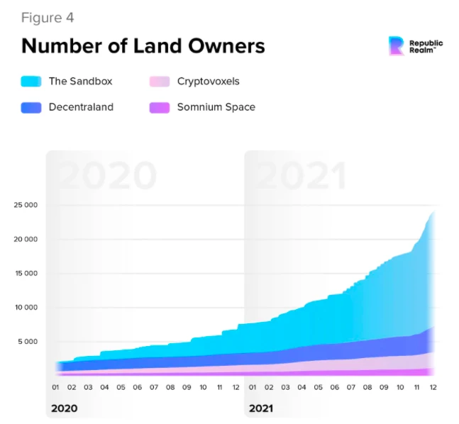 图 5:Cryptovoxels、Decentraland、The Sandbox 和 Somnium Space 中土地所有者的累计总数