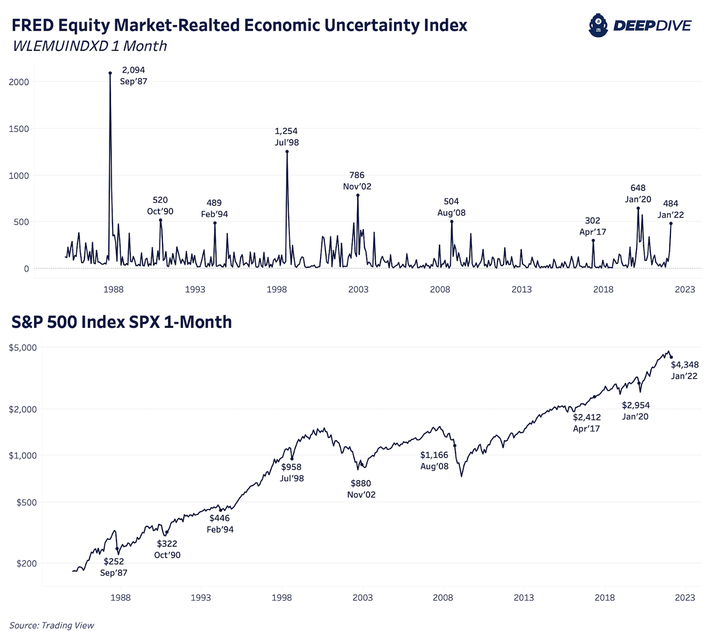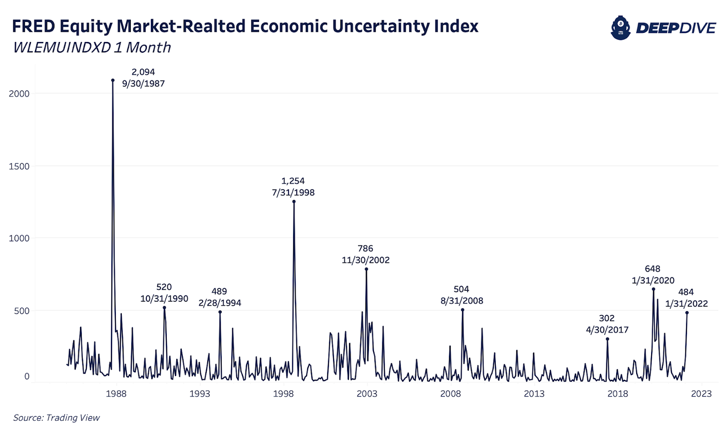 在风险资产流动性持续枯竭的趋势下,FRED 股票相关经济不确定性指数于今天第六次达到了历史新高,而该指数的快速增长往往也伴随着标准普尔 500 指数的大幅下降。