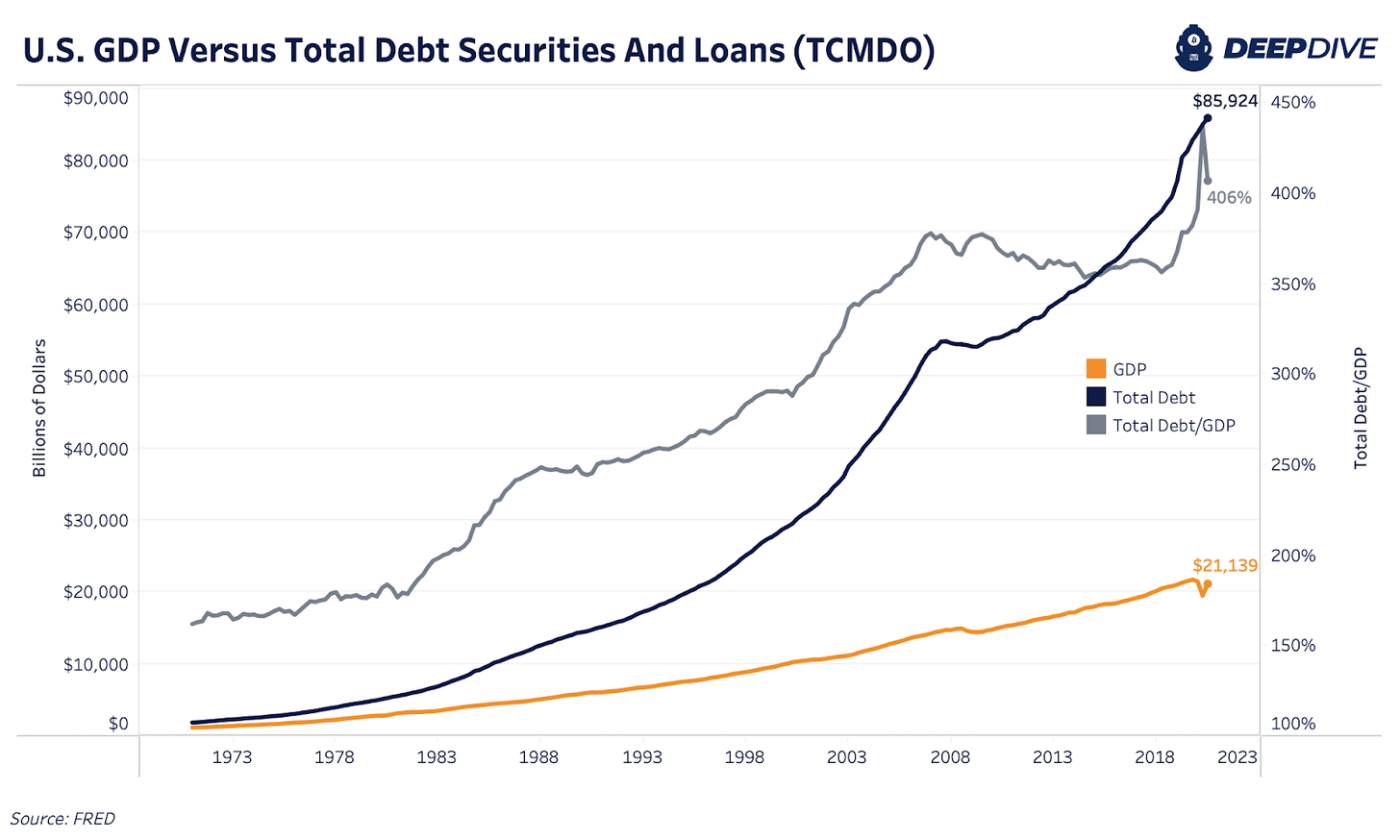 美国债务与 GDP 的总比率约为 400%,这也就意味着,每 100 美元产出的背后都有着 400 美元的带息债务。