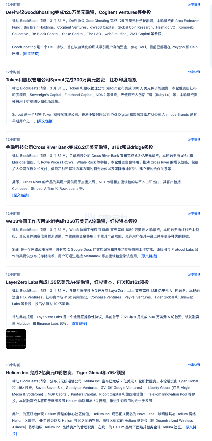 几个小时内,数个项目宣布完成融资,金额少则数百万美元,多则 6.2 亿美元,粗略统计,一夜之间 Web3 世界就完成了超 10 亿美元的融资。红杉资本a16z、Tiger Global 、Lightspeed 这些曾经在互联网世界大杀四方的顶级投资机构频频出现,选中了他们眼中的未来。