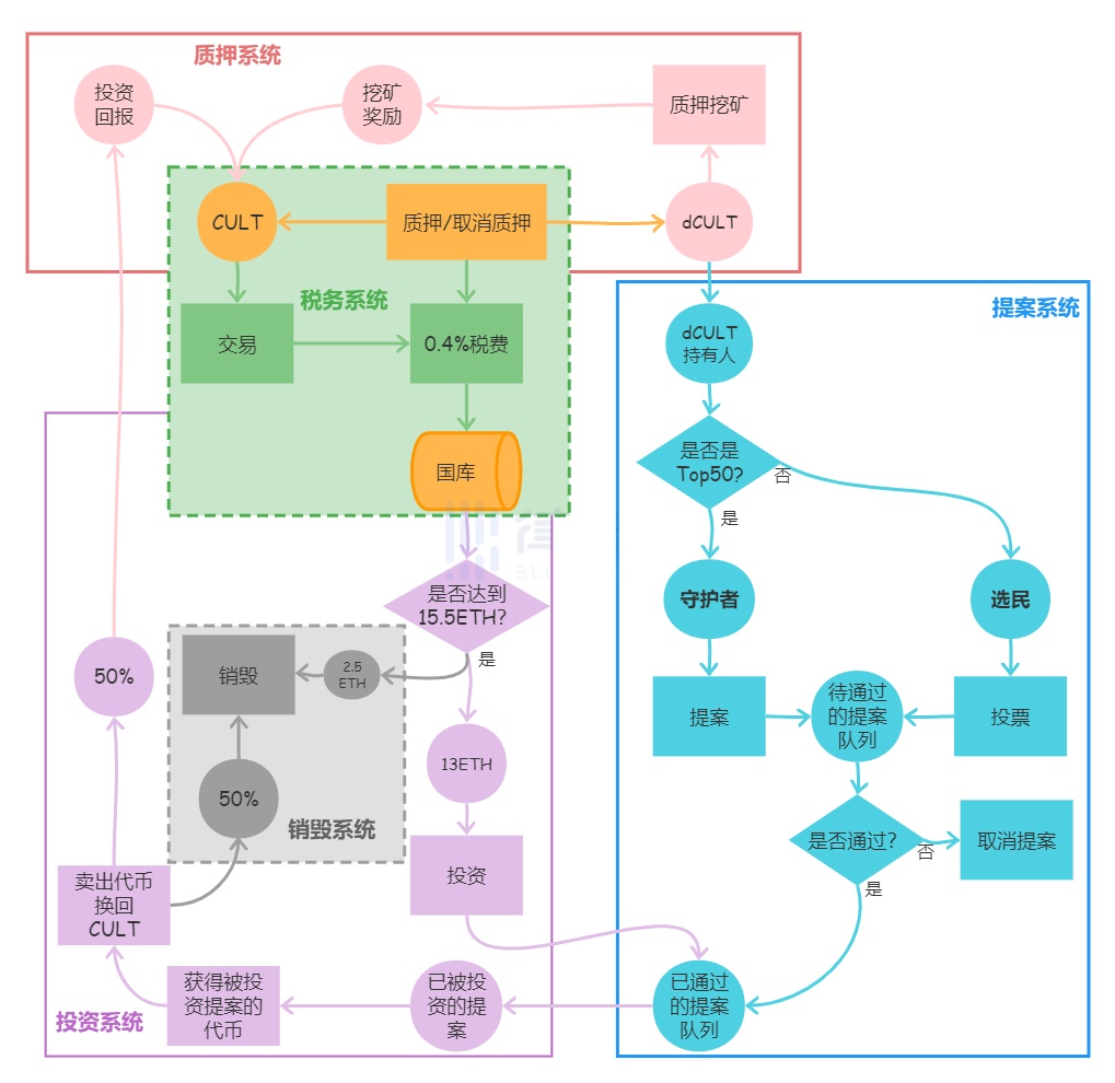 将 CultDAO 的经济模型按照模块划分,分别是由 5 个小的子系统构成,分别是税务系统、质押系统、提案系统、投资系统、销毁系统。每个子系统各司其职又环环相扣,CultDAO 的创始团队已经销毁了智能合约的密钥,合约代码将永远无法升级。