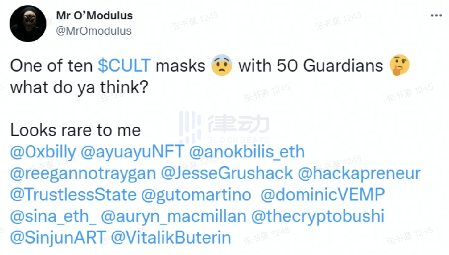 此外,据 CultDAO 声称,Mr O'Modulus 已经邀请了一些知名 Web3 项目的创始人担任守护者,目前对外公开的有:@TrustlessState(Bankless 创始人)、@dominicVEMP(vEmpire DDAO 的 CEO)、@auryn_macmillan(GnosisDAO)、@hackapreneur(Justin Wu)、@only_rares(Ethereum Towers 的 CPO)、@deepcryptodive、@META_DREAMER、@abv_avg_joe等人,目前仍在持续邀请知名人士如以太坊创始人 V 神加入。