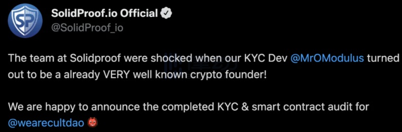 在 Bankless 创始人 David Hoffman 的「What is CultDAO」视频中,作为守护者之一的 David 也不知道 CultDAO 的创始人是谁。他尝试做了一些猜测,但都被否定了。不过,在一家名为 SolidProof 对 CultDAO 审计后,这家审计机构表示该创始人在行业内很知名。