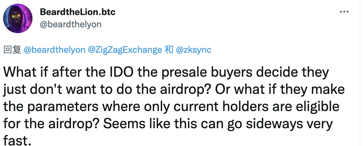 ZigZag 在推文中表示,它也正在面临着蓄意刷空投的行为,在 Zigzag 上已经有数十万个钱包进行交互,但是奖励每一个钱包是不切实际的。于是决定将空投发放规则交给参与 IDO 的 早期 DAO 成员来决定。针对此提议有的用户表示,这会让鲸鱼变成最终利益既得者。鲸鱼会在 IDO 中购买大量代币以获得在治理方面的话语权,从而影响“社区驱动”的空投,这对普通的用户并不公平,也违背了 ZigZag 最初的目的。