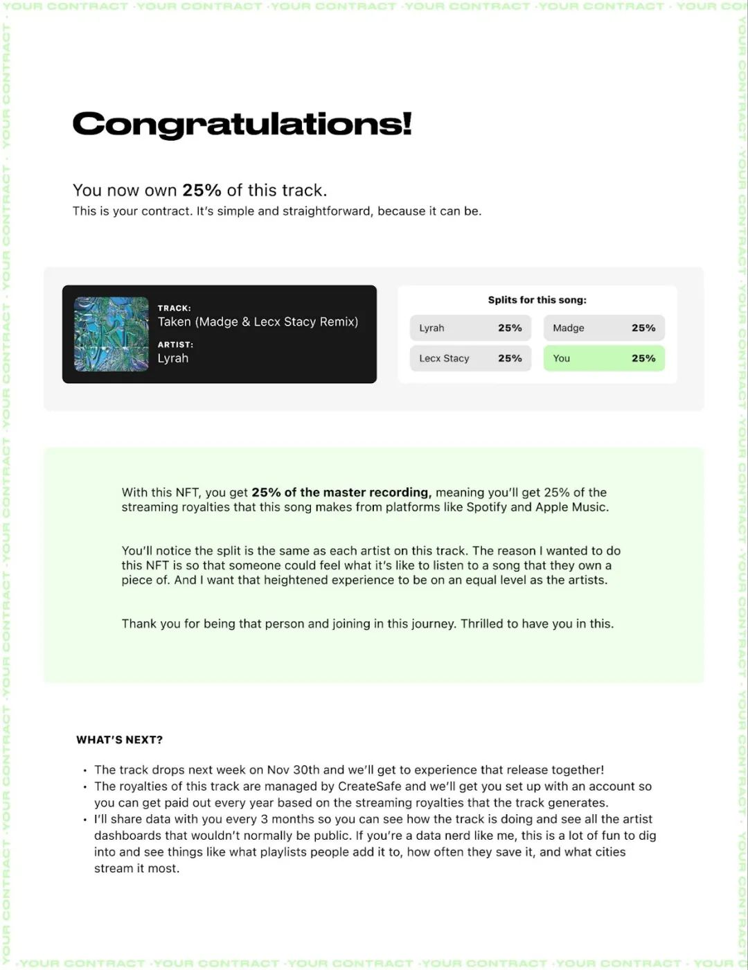 Take Lyrah’s NFT work “Taken” contract as an example, which was generated with the help of the CreateOS platform:The first sentence in the green box reads: "Owning this NFT, you can get 25% of the ownership of this master tape, which also means that you can get 25% of the royalty income of this song on streaming media platforms such as Spotify and Apple Music." 25%."
