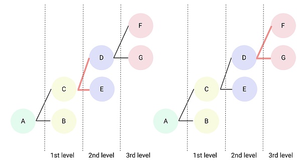 P2P播报示意图,a播报给bc、c播报给de、d播报给fg,以此类推。