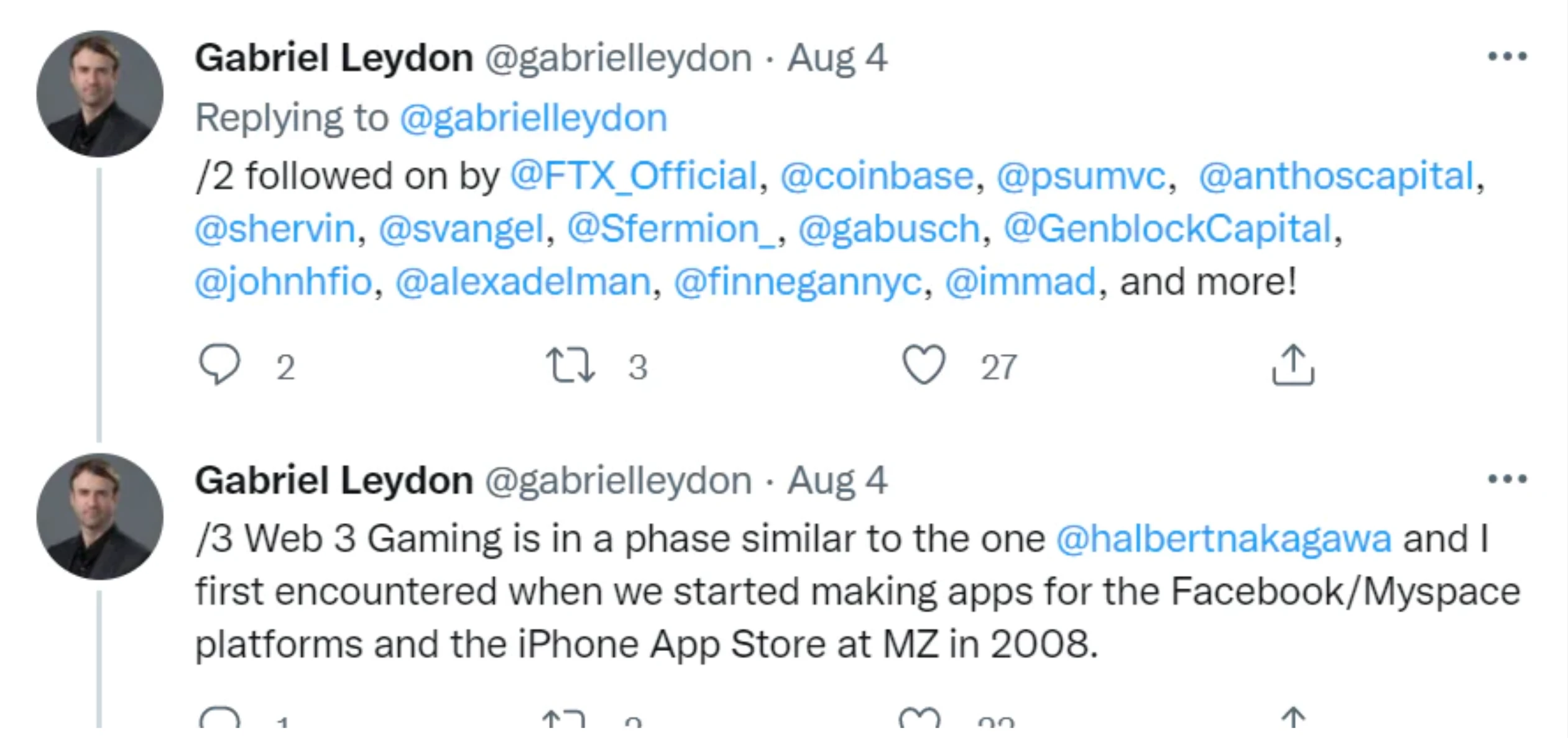 随着对区块链的深入研究,加上Leydon游戏行业的背景,他于2021年开始以个人投资人身份在区块链领域进行投资,典型代表是2021年8月投资了YGG,10月投资了solana生态的Parrellel。