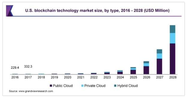 Compared with the private chain, the public chain with read and write permissions open to everyone occupies a larger market share, and at the same time, it also gives more developers a lower threshold to enter the blockchain industry to deploy and start projects. According to the data presented by Coin Ideology Digital, as early as 2020, the global blockchain technology market size has reached 3.67 billion US dollars. According to forecasts, until the end of 2028,The compound annual growth rate of blockchain technology market size will reach 82.4%. Among them, the proportion and growth of the public chain are unmatched.