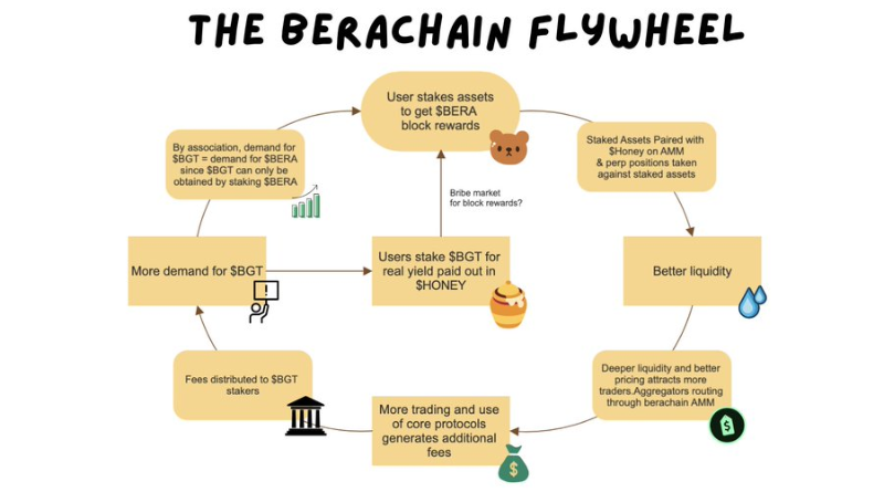 Berachain also has a similar evaluation of "DeFi proto-chain" with Sei. In addition to the pair of public chains of the Move series analyzed above, we can’t help but sigh that the new public chains are also “fighting against each other” and building their own competitive advantages through technology and ecology in the same direction of innovation. Berachain is also an EVM-compatible chain built using the Cosmos SDK. It combines Tendermint, the native consensus mechanism of Cosmos, with its own liquidity proof consensus, so as to provide faster transaction speed, lower transaction cost and instant finality. Not only the liquidity consensus, Berachain's "Tri-Token System", the economic model of the three native currencies is also very technical.