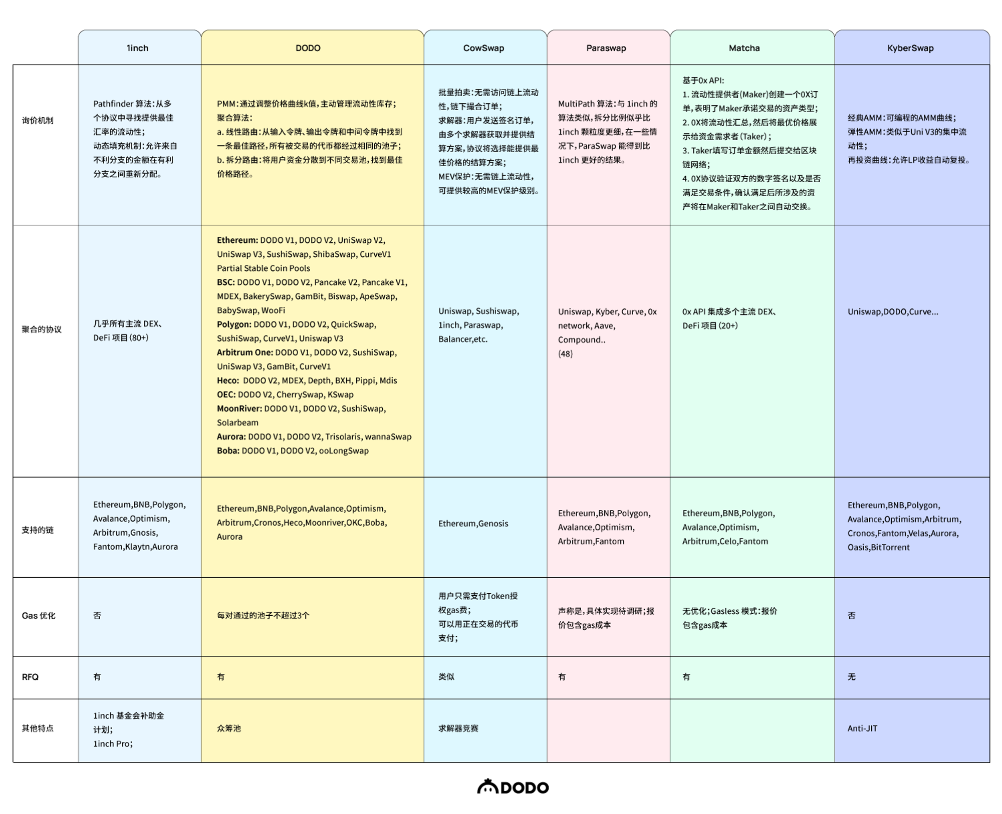 2. DEX aggregator:Aggregate the liquidity of multiple protocols, find the best trading path through algorithms, and reduce transaction costs. Representative projects include 1inch, DODO, Matcha, Paraswap, KyberSwap, and CowSwap.