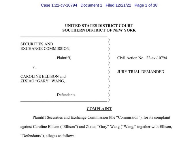 12 月 22 日,前 FTX CEO Sam Bankman-Fried(SBF)从巴哈马被引渡到美国纽约并被 FBI 拘留,纽约联邦检察官上周公布了一项涉及八项罪名的起诉书,如果所有指控都被定罪,他可能会面临数十年的牢狱之灾,而 Alameda Research CEO Caroline Ellison 已承认共谋对 FTX 客户进行电汇欺诈、对 Alameda Research 贷方进行电汇欺诈、商品欺诈、证券欺诈和洗钱等七项罪名,最高可判处 110 年监禁;FTX 联合创始人 Gary Wang 则承认共谋对 FTX 客户进行电汇欺诈、商品欺诈和证券欺诈等四项罪名,或将面临最高 50 年的监禁。根据一份流出美国证券交易委员会在纽约南区法院提交的法律文件,我们从中梳理出本案的 12 个要点: