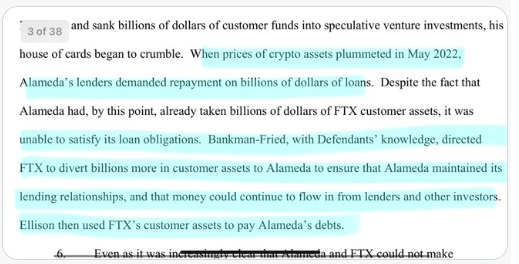 3、 2022 年 5 月,Alameda Research 发现大事不妙。当时该基金已经“借入”了数十亿美元的 FTX 客户资产,然而加密市场的剧烈波动让 Alameda Research(也包括 SBF)无法履行借款人义务,结果 SBF 愈发疯狂,让 Caroline 拿走更多 FTX 客户的钱。