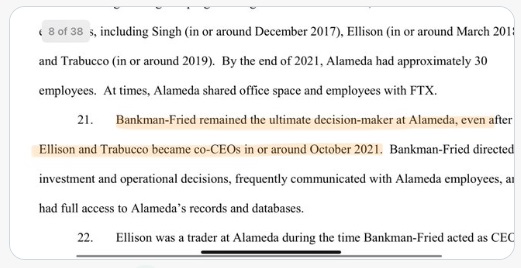 6、SBF 自始至终都拥有对 Alameda Research 的绝对控制权。即使在 2021 年任命了 Caroline 和 Sam Trabucco 担任 Alameda Research 的联席首席执行官,但 SBF 始终拥有对该基金的控制权,他经常与基金员工交流,也可以完全访问基金账簿和交易记录——“Alameda 属于 SBF 一个人”,这句话绝对有道理。