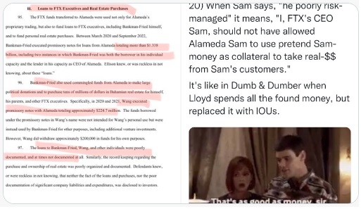 1、SBF 撒了弥天大谎,Gary Wang 为 Alameda Research 建立了 “FTX 后门”并用于洗钱,而 Caroline Ellison 则将 Alameda Research 变成了 SBF 的个人基金,SBF 开始疯狂购买房地产、风险投资、给美国政客捐款。