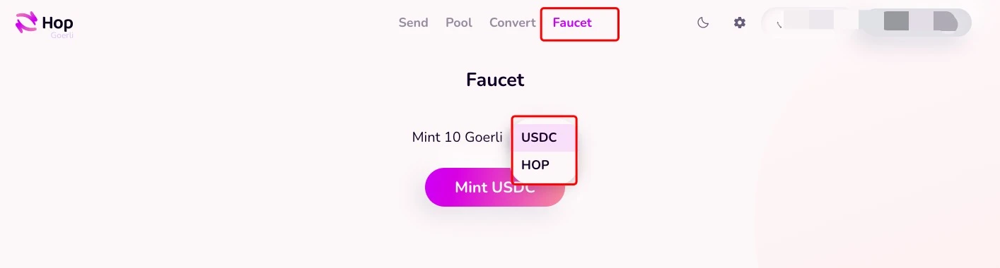 我们尽可能将该页面的所有功能都交互一遍。下面可以点击 Faucet,铸造一些 USDC 和 HOP 代币。然后点击 Send 将铸造好的 USDC 和 HOP 再桥接至 Linea 测试网中。