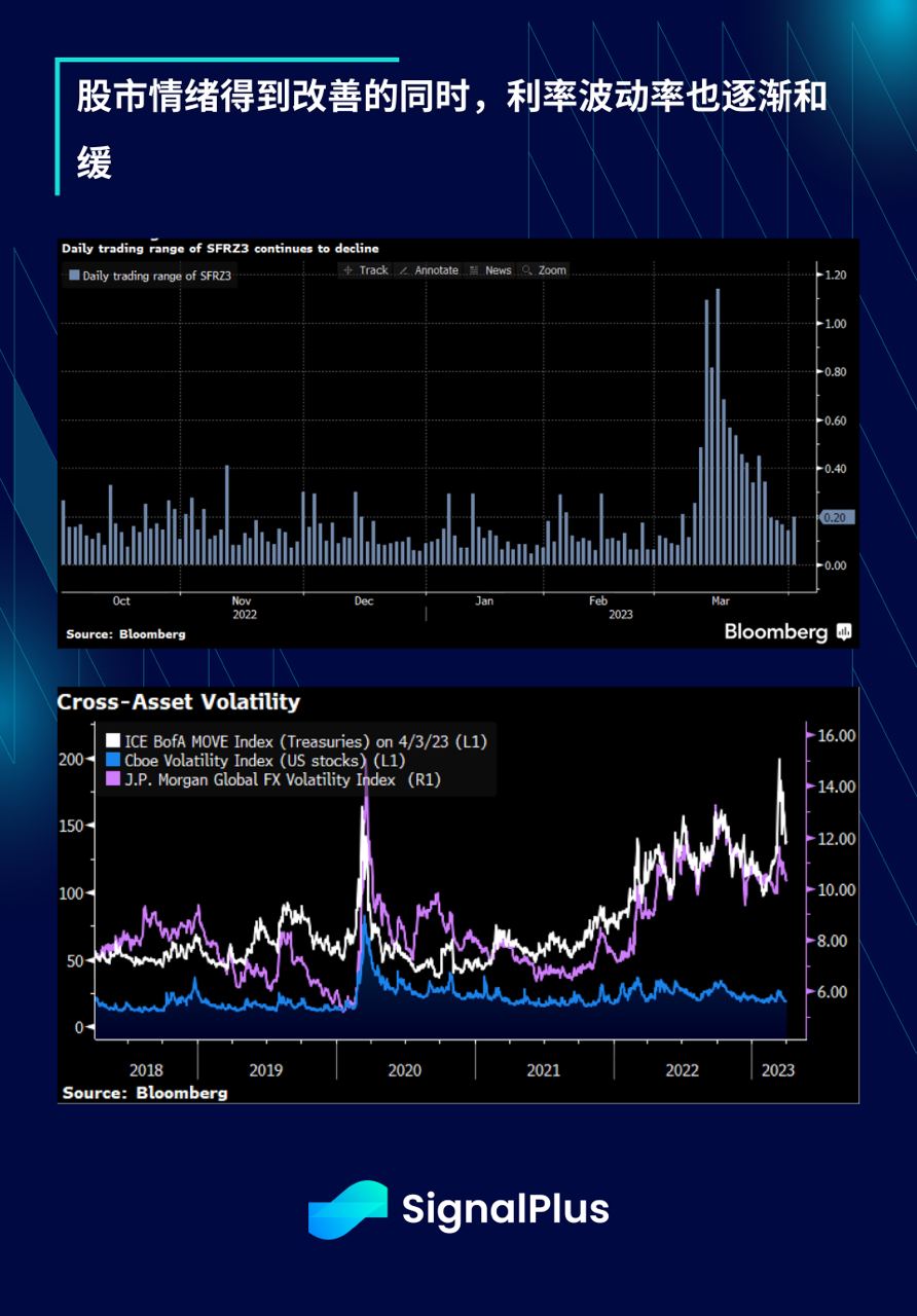 - 股市情绪得到改善的同时,利率波动率也逐渐和缓。12 月 SOFR 期货出现 3 月初以来最低的日内波动,而整体 MOVE 指数也从 3 月高点大幅回落。市场预测 5 月加息的机率回到约 65% 的水平,对于 2023 年底前累计降息的预期大约是 60 个基点,低于几周前的 85 个基点。