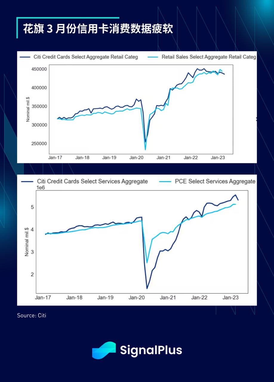 - 花旗 3 月份信用卡消费数据疲软,初步估计消费支出环比下降约 0.7% ,显示整体消费正从 2022 年的水平逐渐趋缓,初步的 Select Services Aggregate 数据环比下降高达 4.13% ,主要受娱乐和交通项目拖累。