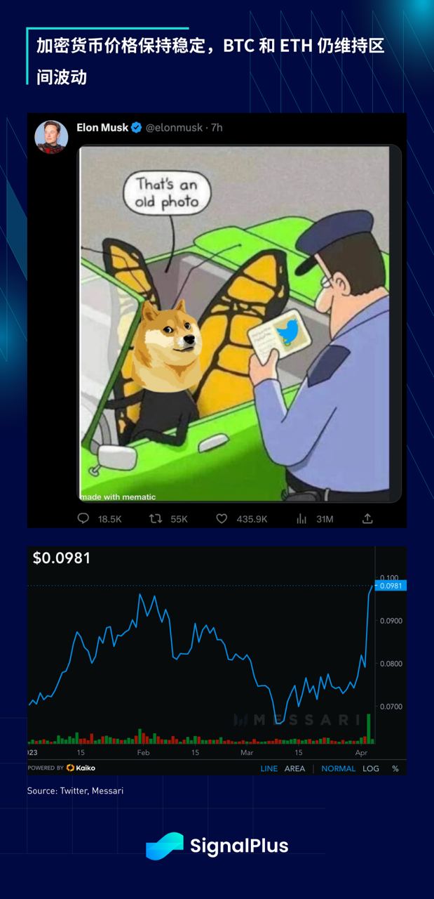 - 加密货币价格保持稳定,BTCETH 仍维持区间波动,最有趣的一条消息可能是 Elon Musk 将推特标志从蓝鸟变成了 Dogecoin,随著这位富有创意的企业家继续展示对这个代币的情有独钟,狗狗币价格也因此飙升了 20% 。