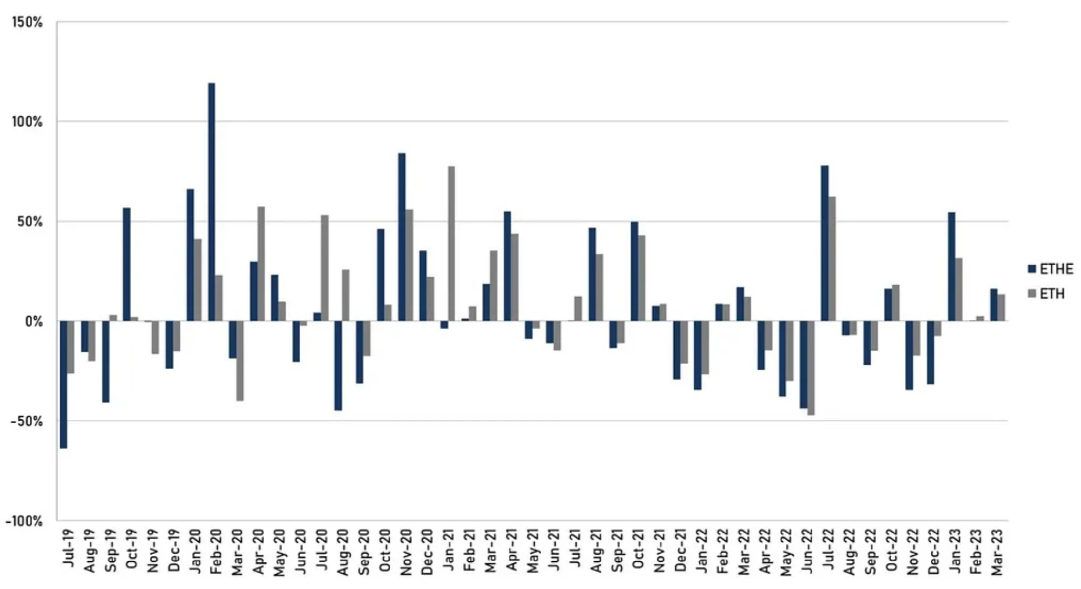 图 9 :Monthly Return ETHE Vs. ETH(可以看出在短周期表现上 ETHE 弹性大于 ETH)
