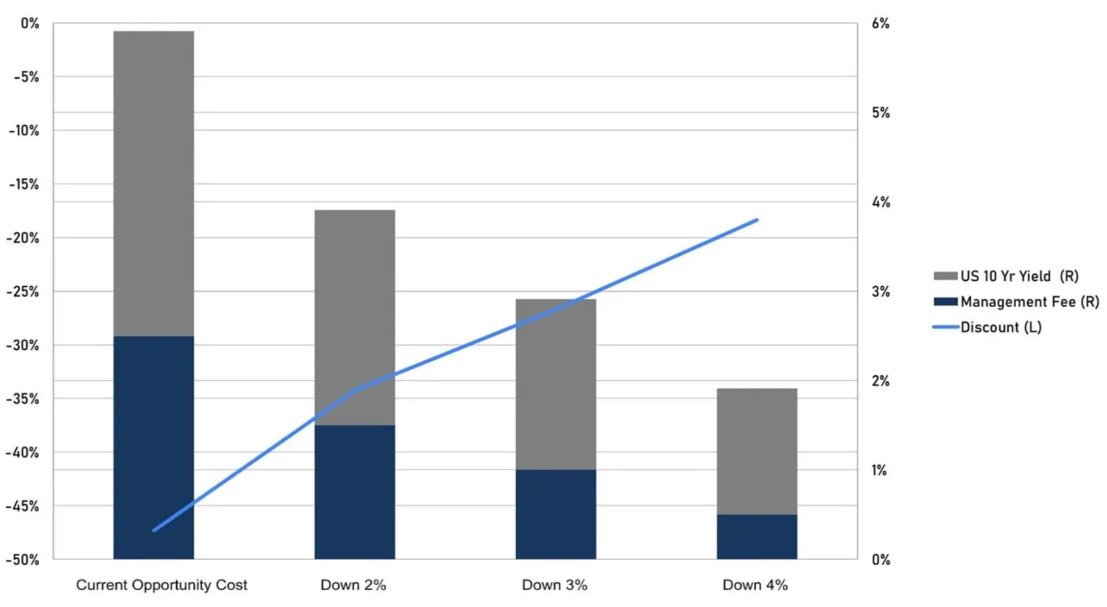 10 年期国债与管理费各下降 1 个百分点,此时机会成本是年化 3.91% ,可帮助折价从 -47.3% 收窄到 -34.2% ;