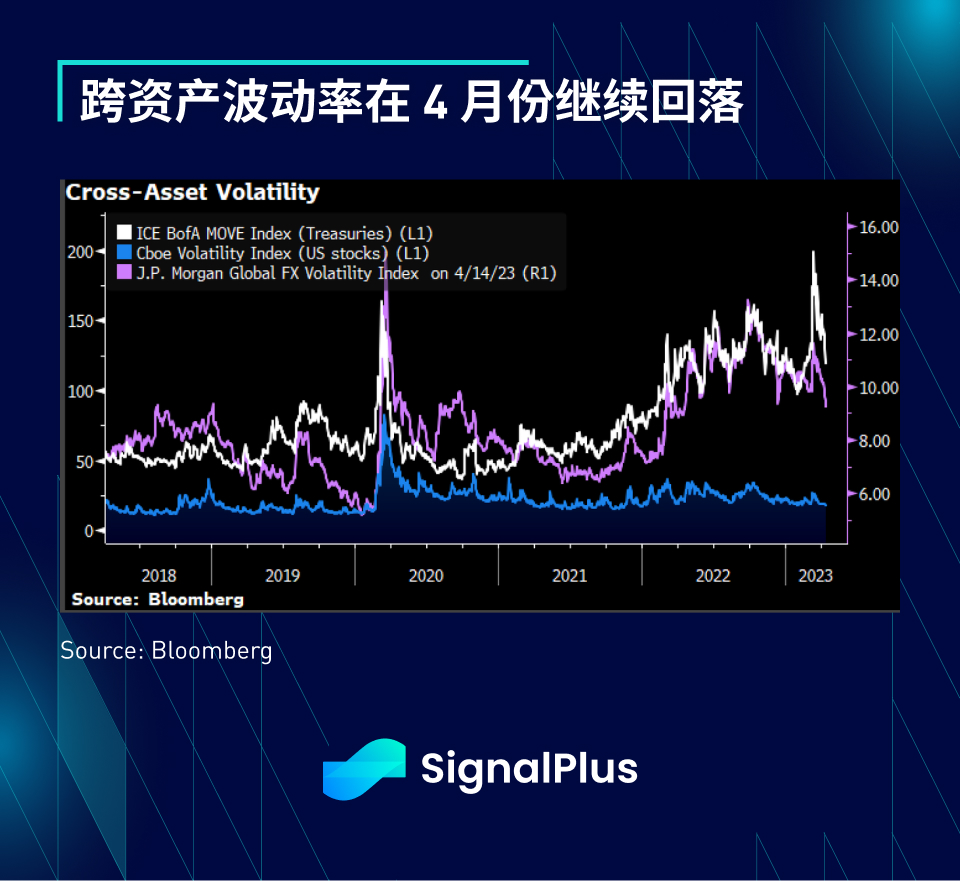 跨资产波动率在 4 月份继续回落,利率和外汇波动率回落至 2022 年第四季度的水平,而股市也在正在重返 3 年低点。整体通胀走软(虽然仍高于目标),工资增长放缓,银行业危机消退,且美联储尚未对当前隐含的降息预期积极回应,这些因素似乎共同构建了软著陆的理想情景,使得资产价格在 4 月份自动走强。