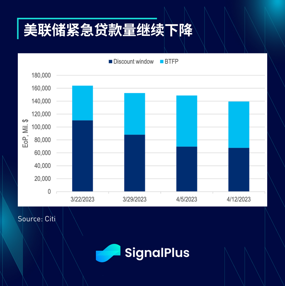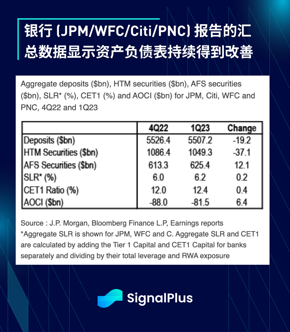 美联储的 H.8 报告显示资产负债表连续第 4 周保持稳定,截至 4 月 12 日当周,通过贴现窗口和 BTFP 向银行系统提供的紧急流动性从前一周的 1490 亿美元降至 1395 亿美元;此外, 4 家大型银行(JPM/Citi/Wells Fargo/PNC)的汇总数据显示 AOCI(减去累计损失)和 SLR/CET 1 比率持续得到改善;另外,货币市场基金也只有 303 亿美元的流入,看来存款外逃的最坏情况似乎已经过去了。