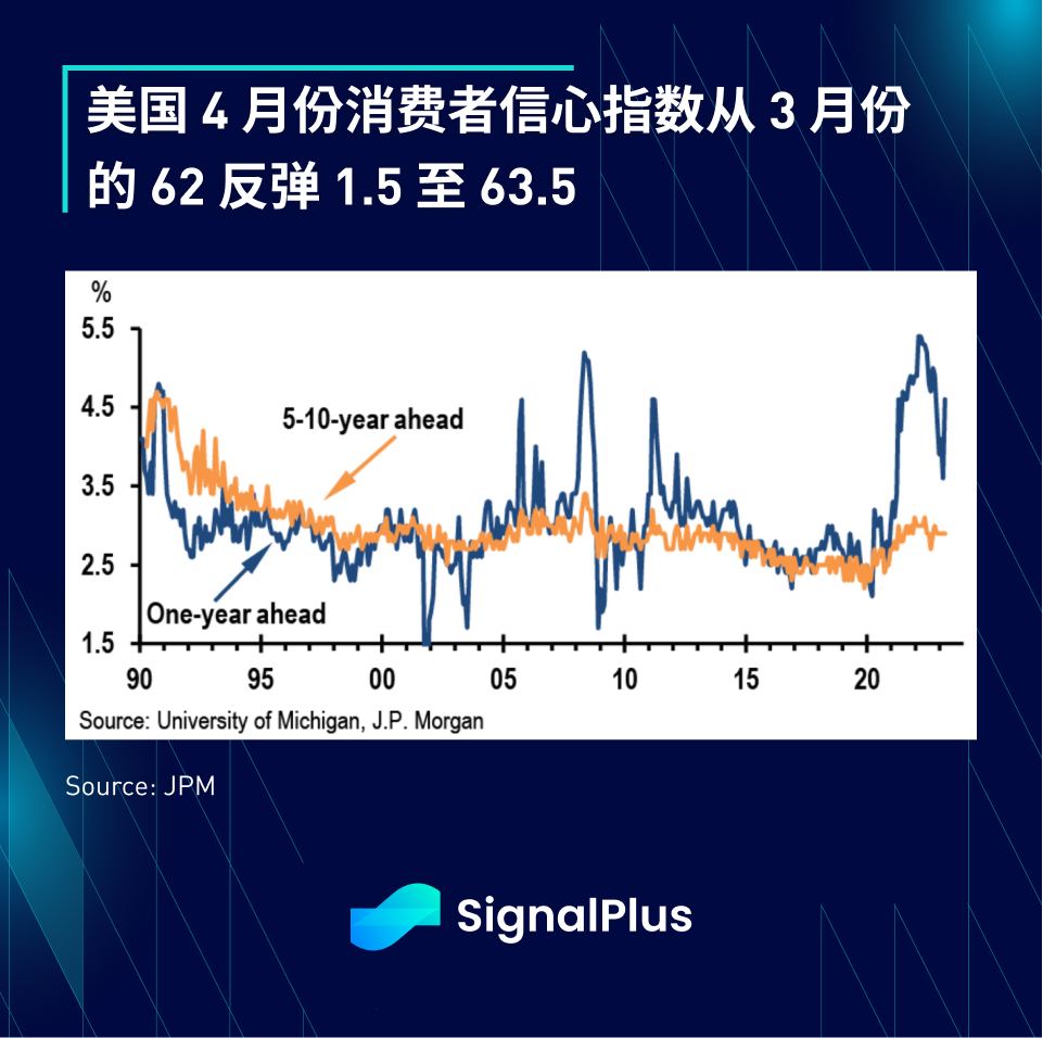 美国 4 月份消费者信心指数从 3 月份的 62 反弹 1.5 至 63.5 ,现况指数和预期指数均有所改善;然而, 1 年期通胀预期意外从上个月的 3.6% 跃升至 4.6% ,处于 11 月 4.9% 峰值以来的最高水平。